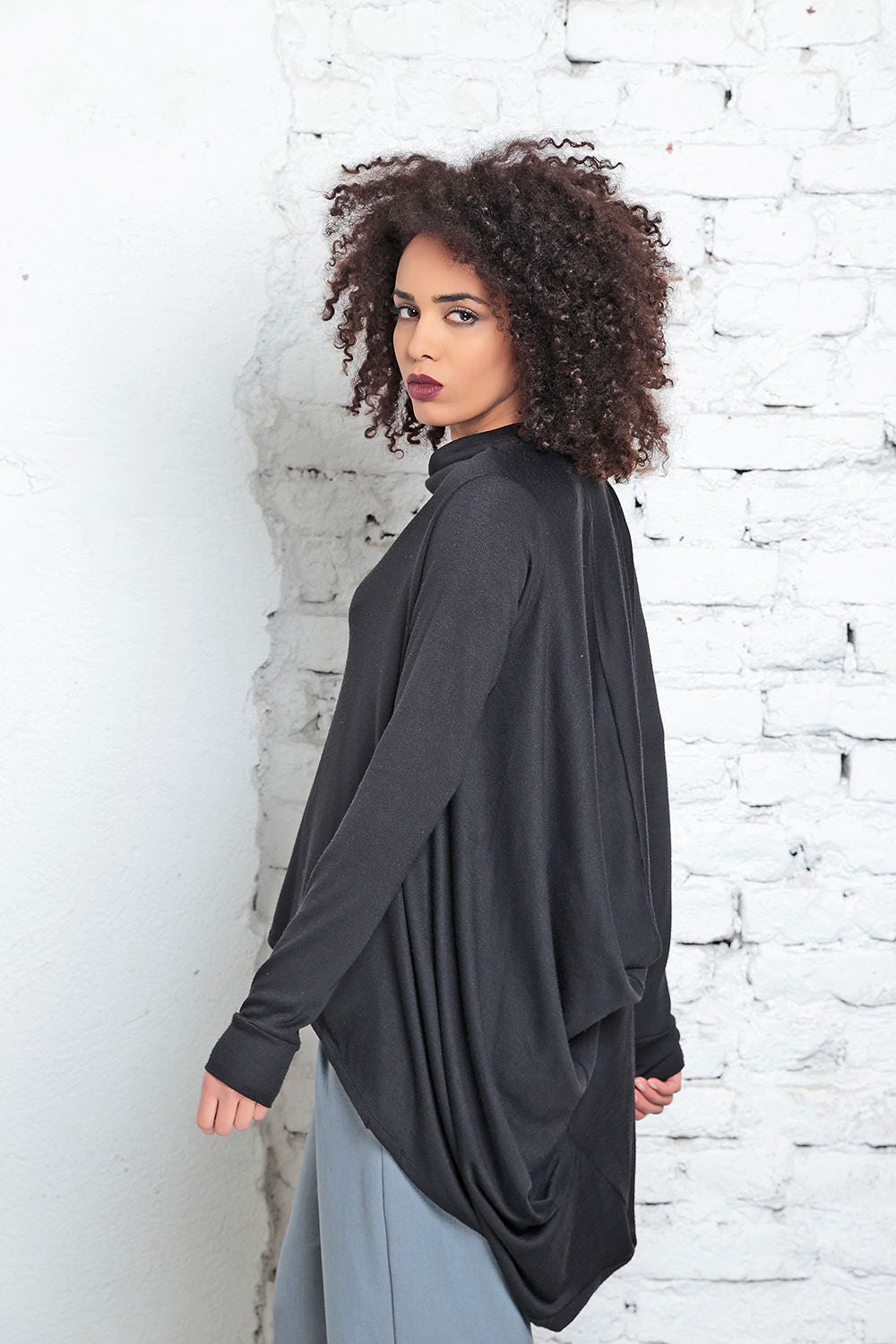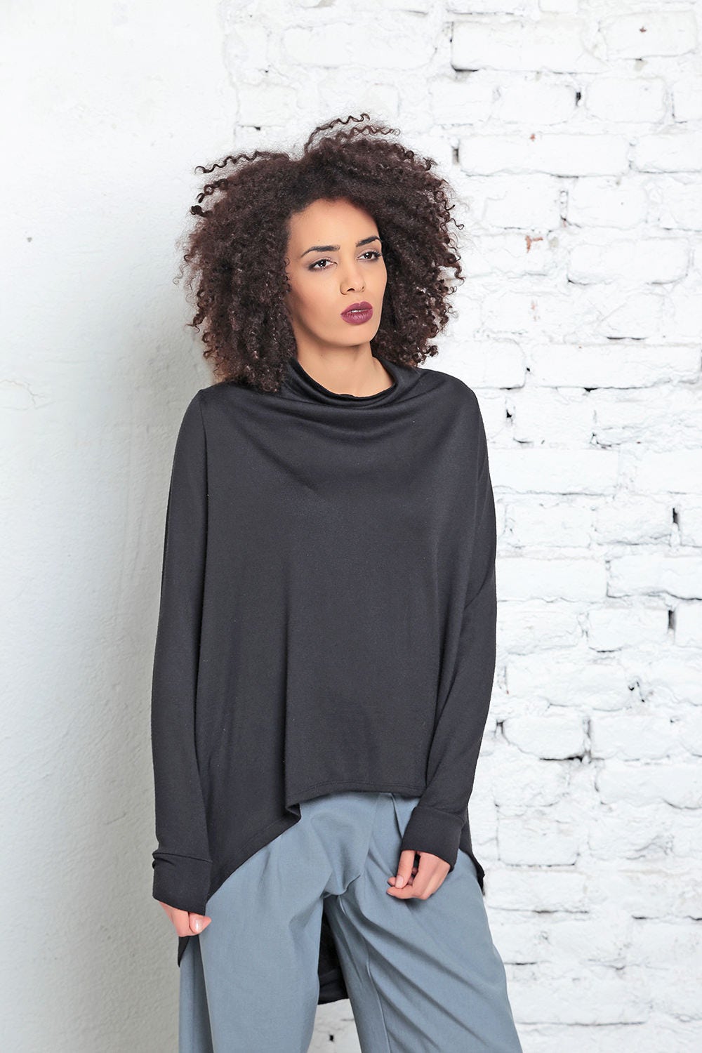 This top boasts a loose, relaxed silhouette that's perfect for any occasion. The cowl neckline adds a touch of elegance, while the clean long sleeves design with cuffs keeps the look timeless. The draped back detail creates a unique and eye-catching element that's sure to turn heads. Made from high-quality knitted fabric, this top is soft, comfortable, and durable, making it a must-have for any fashion-conscious individual. Whether you dress it up or down, this top is sure to become a staple in your wardrobe!
