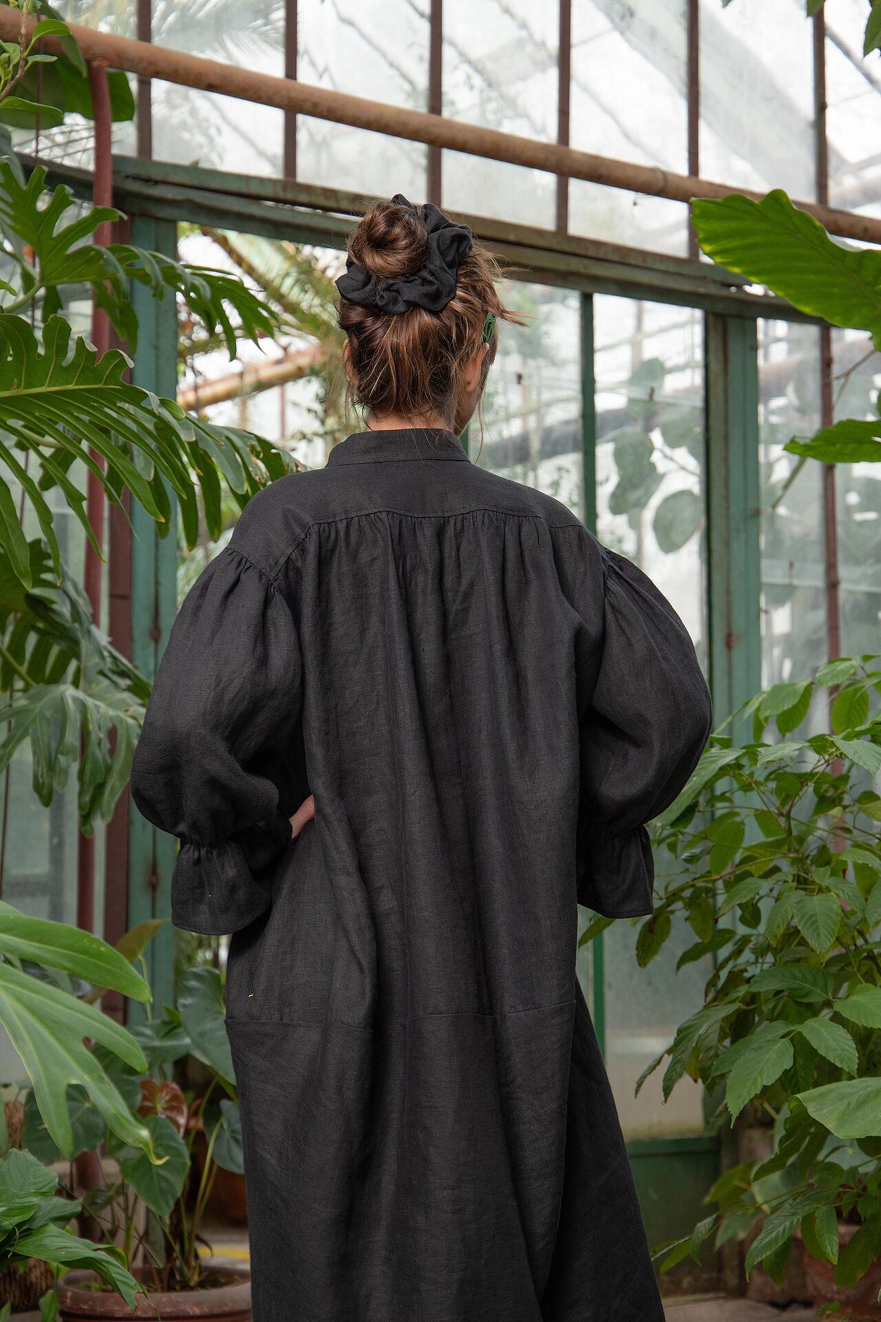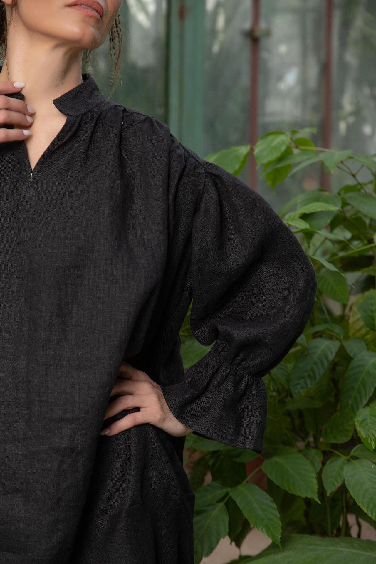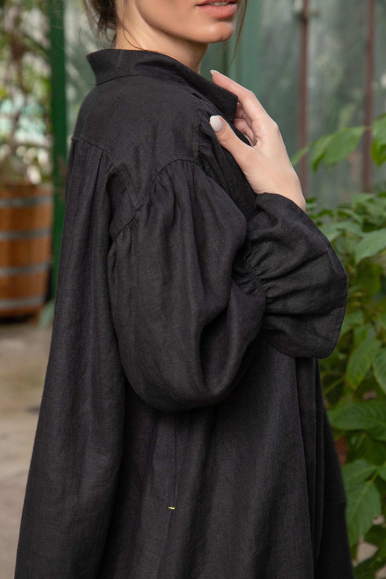 This boho-inspired linen dress is a must-have for any summer wardrobe. The relaxed silhouette features a half collar, open neckline, and pockets, while the voluminous long sleeves with beautiful cuffs add a touch of elegance. The back of the dress has a panel that extends to the shoulders, and there is gathering at both the shoulders and the back. The widest part of the dress is at the hips, before gradually tapering to a narrower fit. The dress falls just below the calf , making it perfect to wear with sandals or ankle boots.