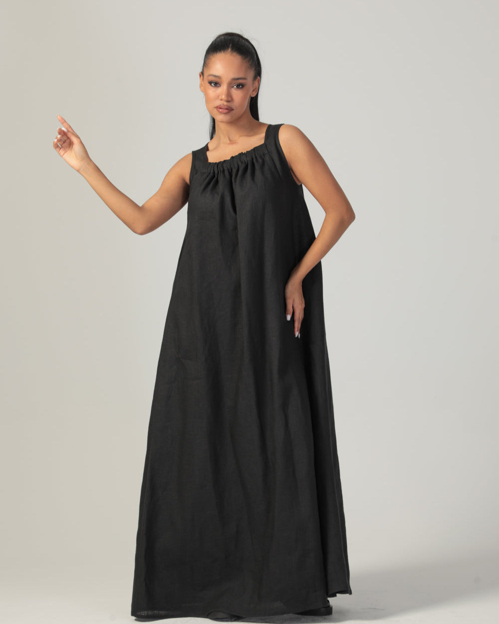 Experience effortless elegance and timeless design with the Clara Black Maxi Dress. Featuring a beautifully gathered neckline, this dress offers a relaxed yet sophisticated silhouette, perfect for any occasion. Crafted from high-quality, breathable fabric, it drapes gracefully, providing both comfort and style throughout the day. The sleeveless design adds versatility, making it an ideal choice for warm-weather outings or layering during the cooler seasons.