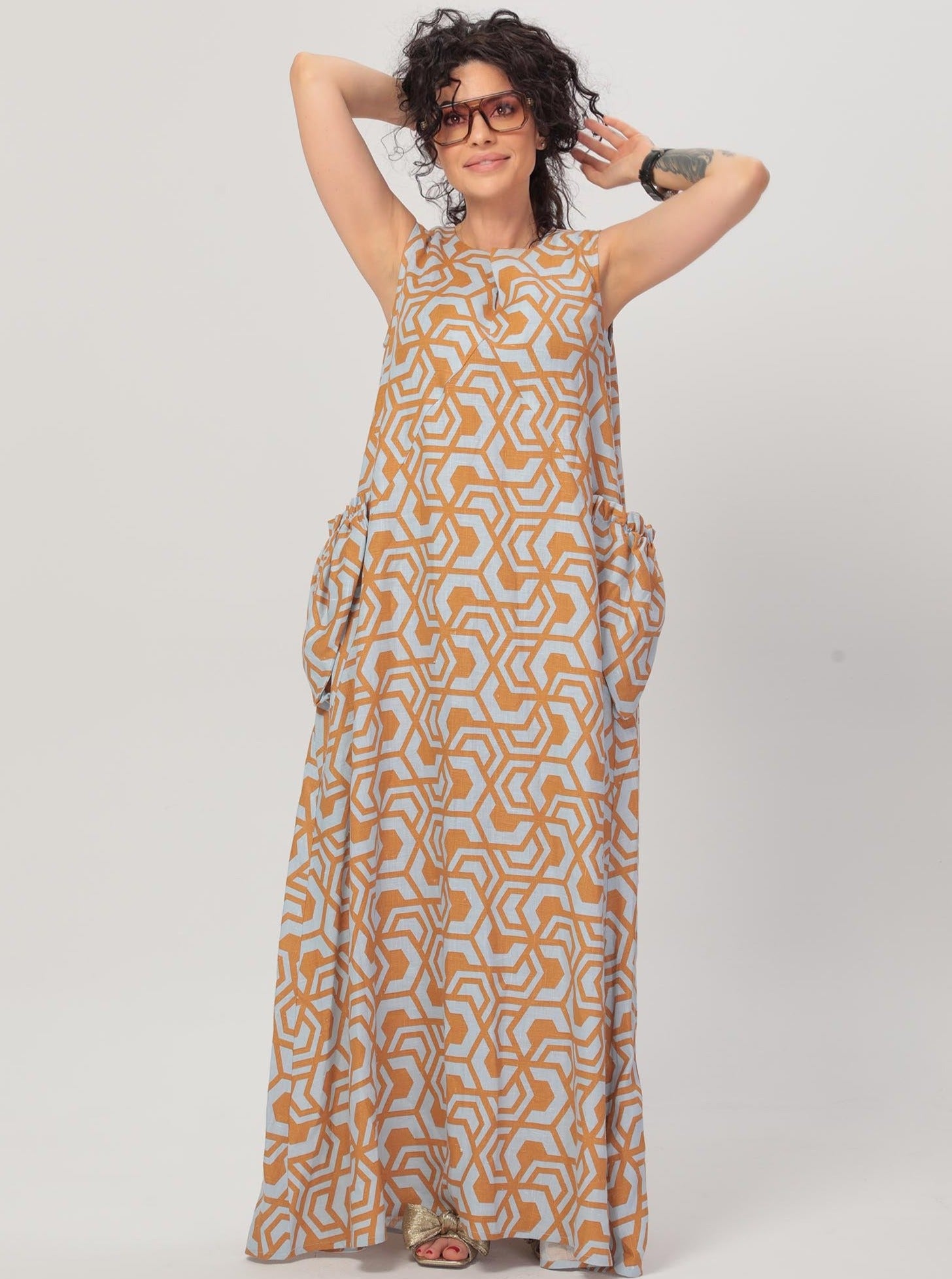 Introducing the Emily Dress crafted from premium quality linen. Featuring an A-line silhouette, this sleeveless dress is adorned with comfortable triangular-shaped side pockets and an intriguing neckline. Elevate your wardrobe with this chic and versatile piece, perfect for any occasion.