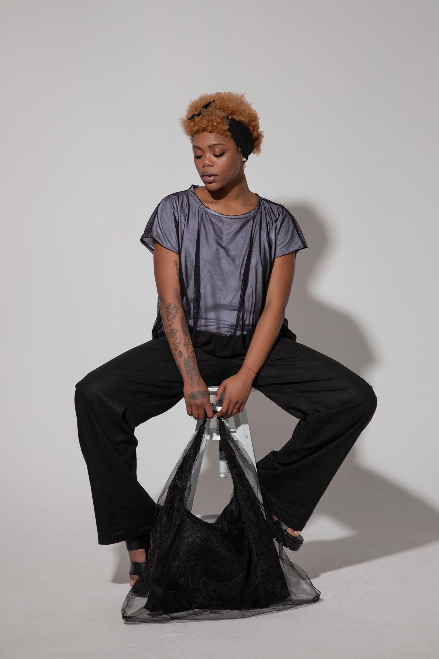 Introducing IDRA's tulle bag, a unique and extravagant addition to any outfit. The bag features a solid linen base with a tulle top that adds volume and creates a stunning visual effect. The bag is secured with a snap closure for easy and convenient use. Whether you're dressing up for a special occasion or simply adding some flair to your everyday look, this bag is the perfect statement piece. Its striking design is sure to turn heads and elevate your style.
