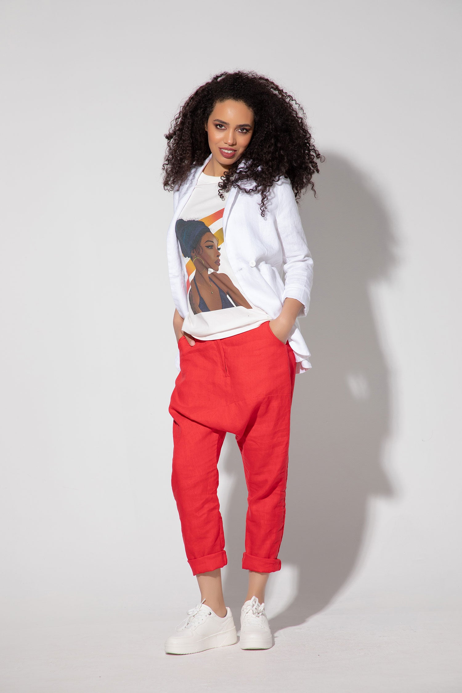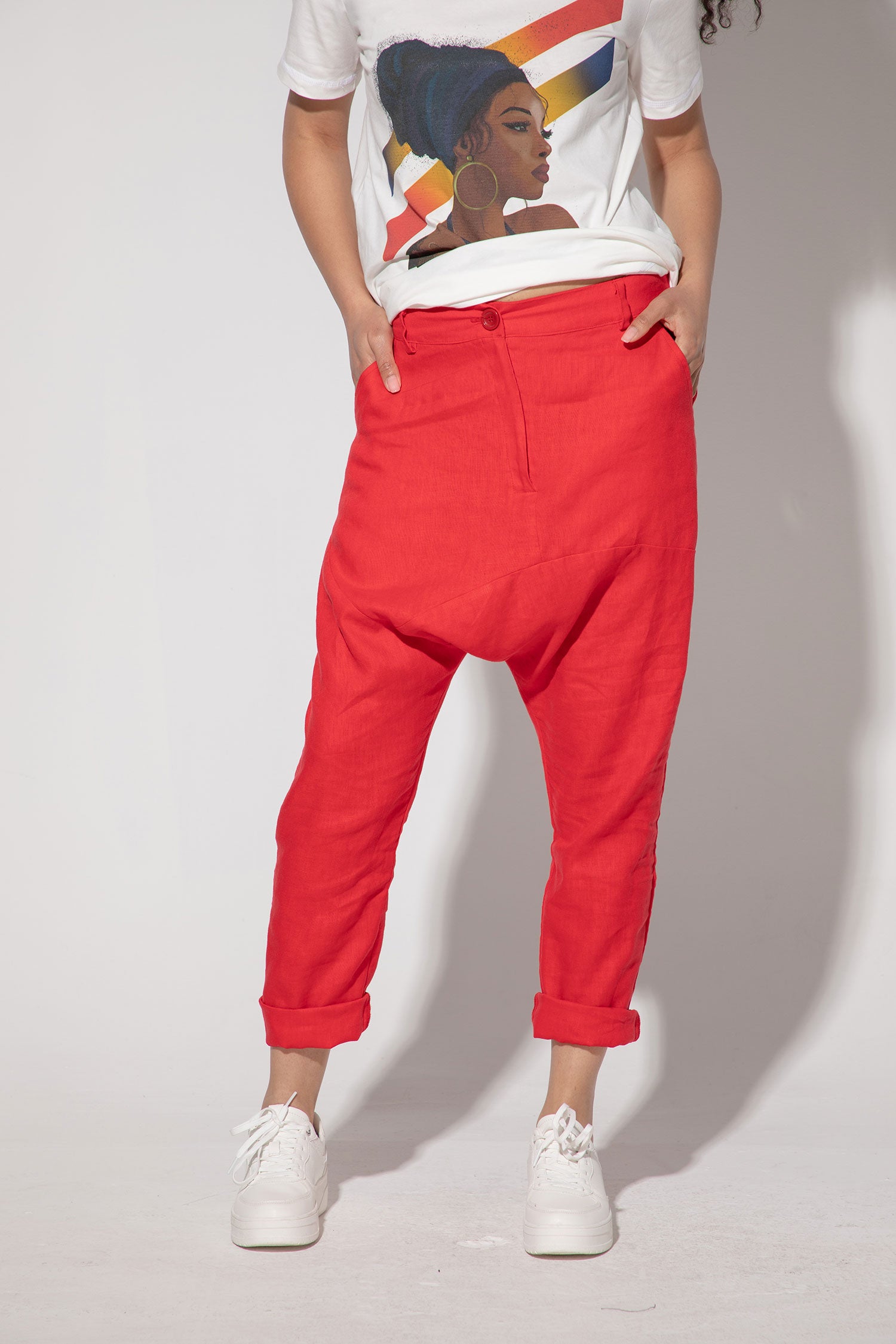 Elevate your style with these linen pants featuring a dropped crotch and narrow legs with a normal waistline. The asymmetrical seams and pockets add an edgy touch to the overall design, making these pants perfect for anyone who wants to stand out. Choose from a variety of color options to match your personal style. Made from high-quality linen, these pants are comfortable and breathable, making them ideal for all-day wear. Shop now and add a touch of sophistication to your wardrobe.