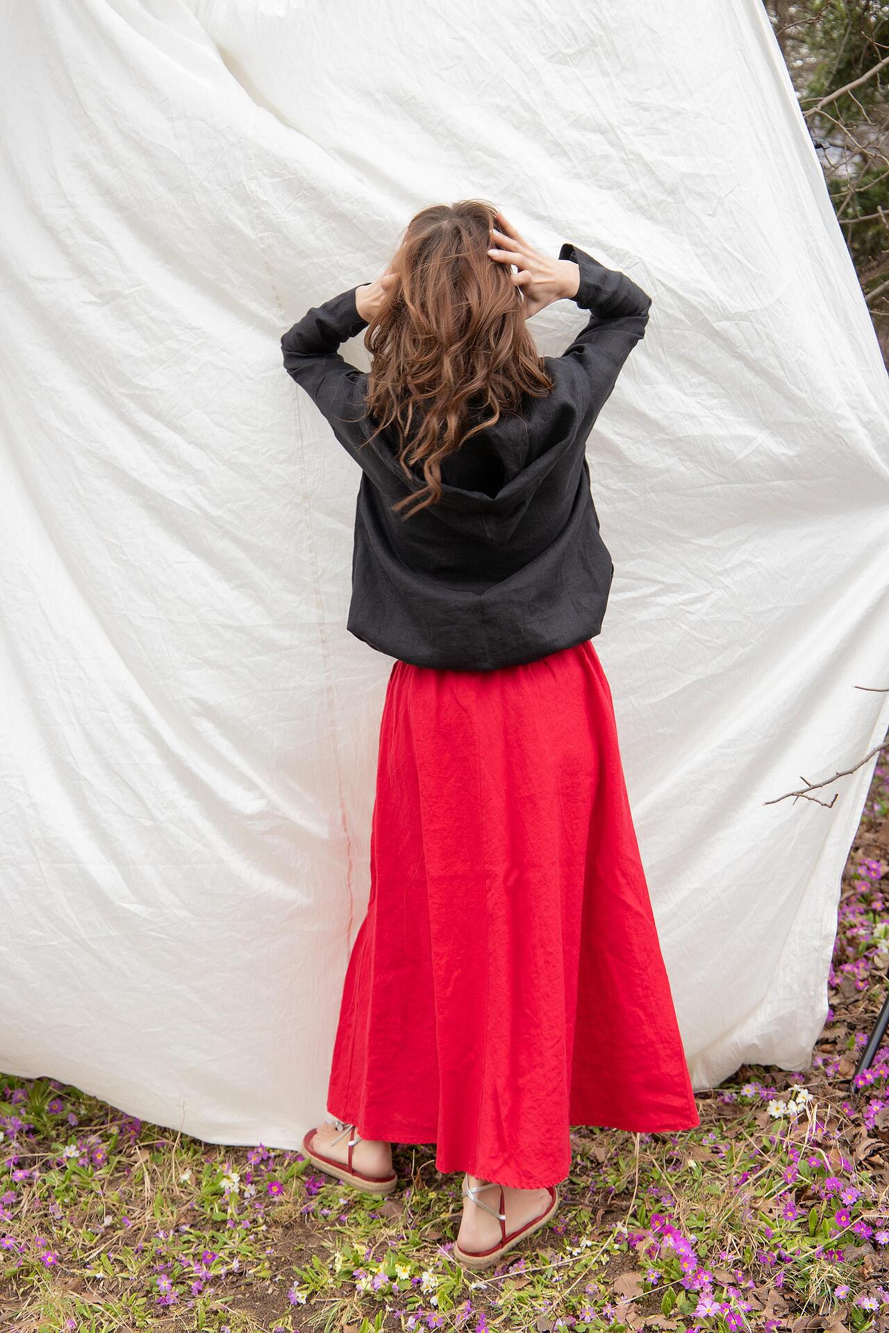 Introducing the RASHIDA, a beautiful and practical maxi skirt made from soft linen fabric. This skirt falls just above the ankle, making it the perfect length for any occasion. The relaxed fit and flowy silhouette make it comfortable to wear in any weather, while the practical side pockets add a touch of functionality to this stylish piece.