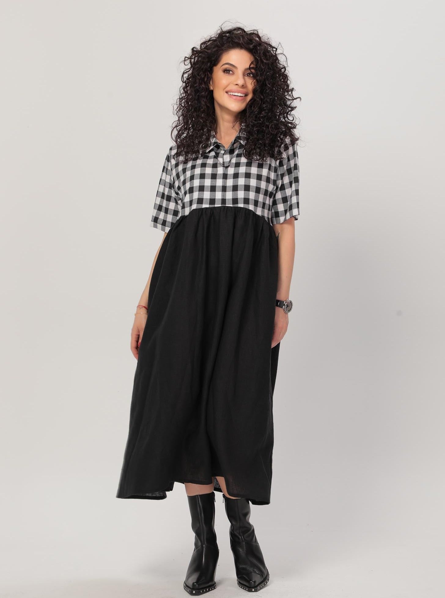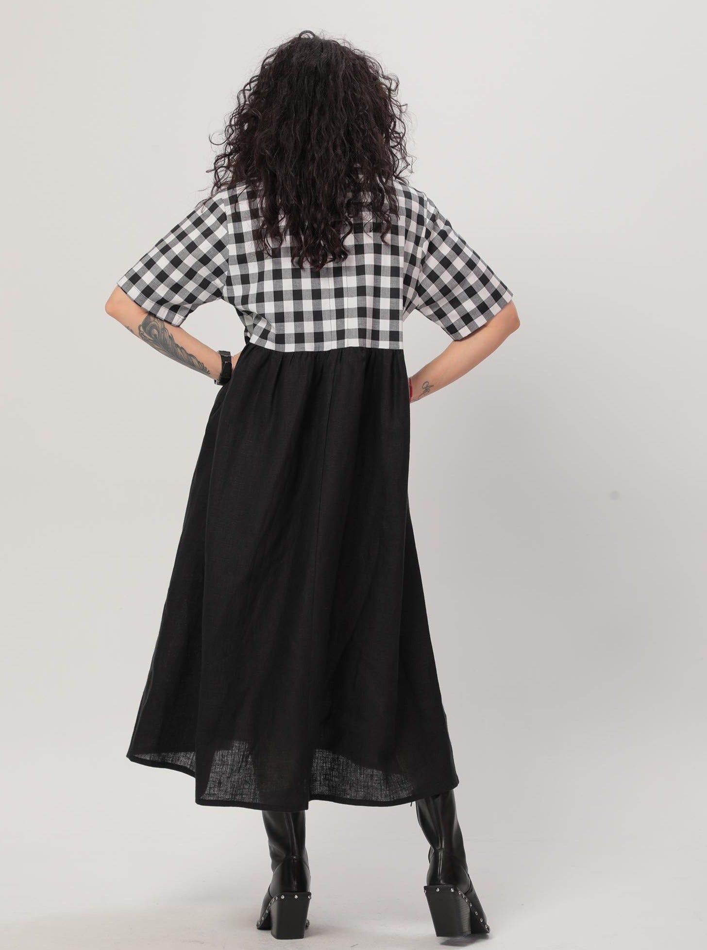 Introducing our Lisa Dress, a perfect blend of style and comfort. Crafted from high-quality linen in the lower part and featuring a black and white gingham pattern in the upper section made from premium cotton. This midi-length dress boasts a subtle flare, offering a lightweight feel and effortless elegance. Complete with a classic collar and convenient side pockets discreetly integrated into the side seams. Ideal for any occasion, this dress combines sophistication with practicality.