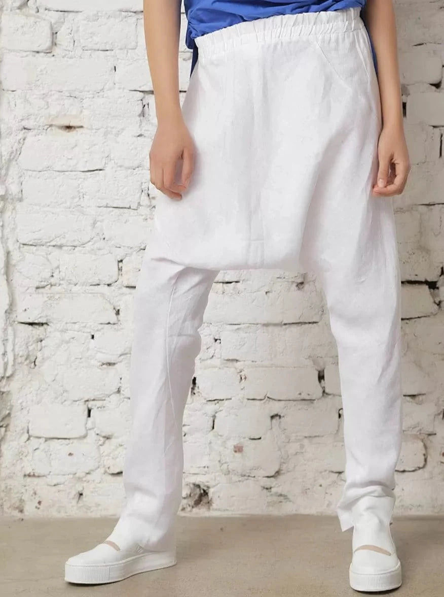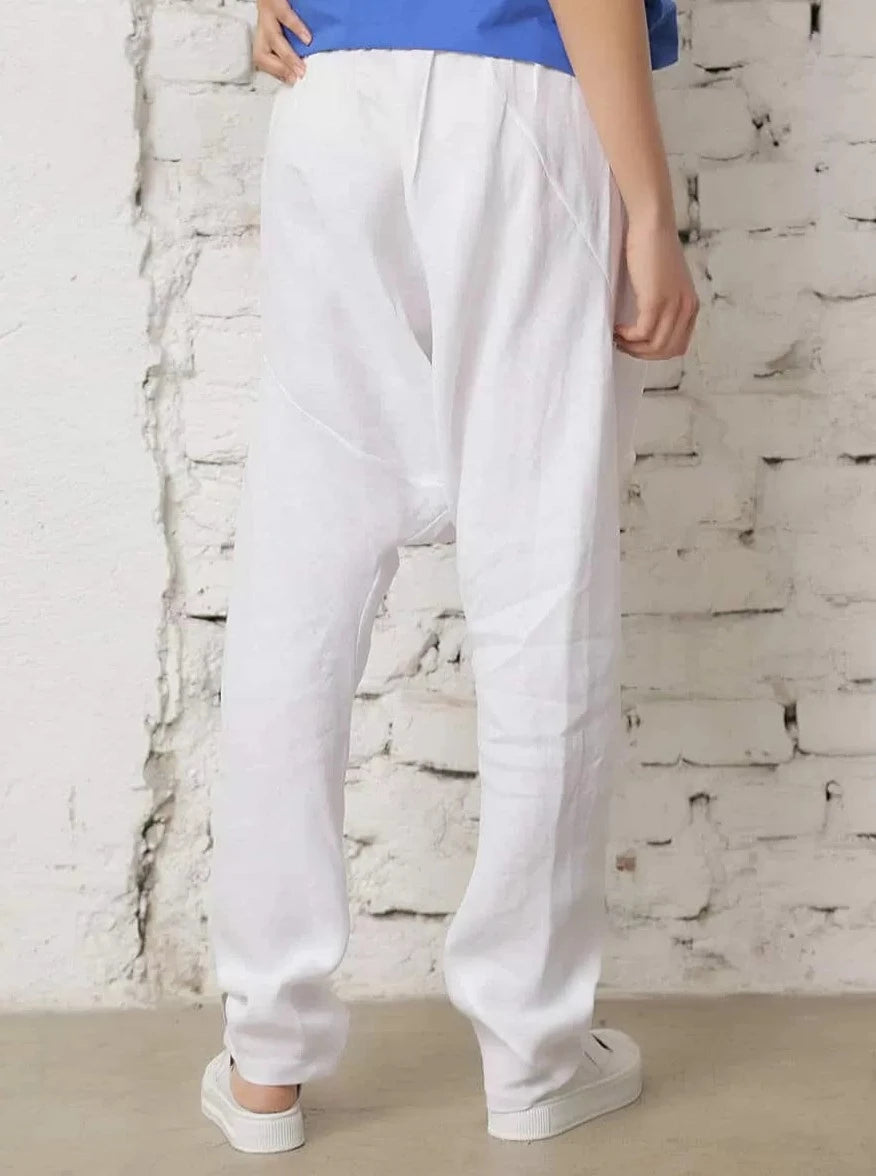 Discover our linen trousers, where comfort meets style effortlessly. With their elastic waistband and asymmetrical seams, these pants not only look great but also provide the perfect feel all day long. Whether you're at the beach or strolling through the city, these trousers embody lightness and summer aesthetics, making them the ideal choice for any occasion. Experience the comfort of Harem-style fit and feel the freshness of linen fabric delicately against your skin.