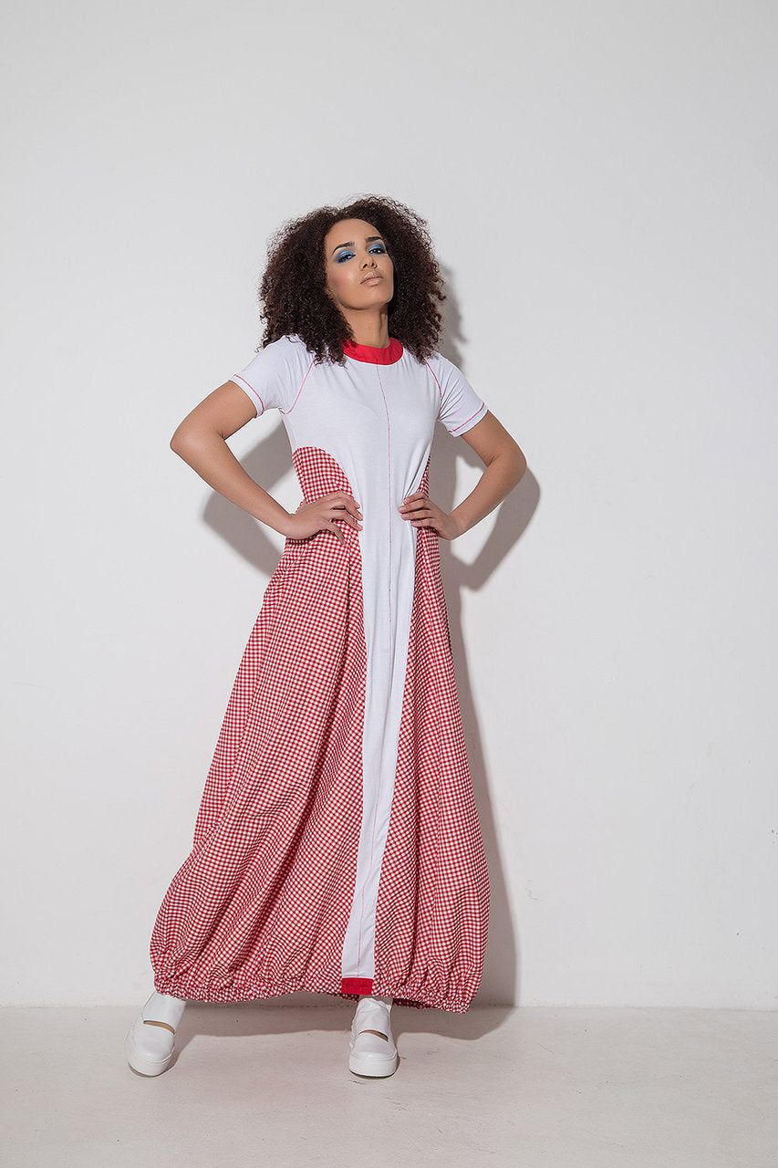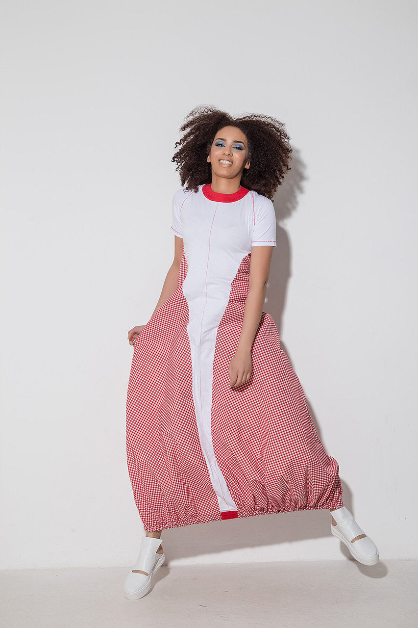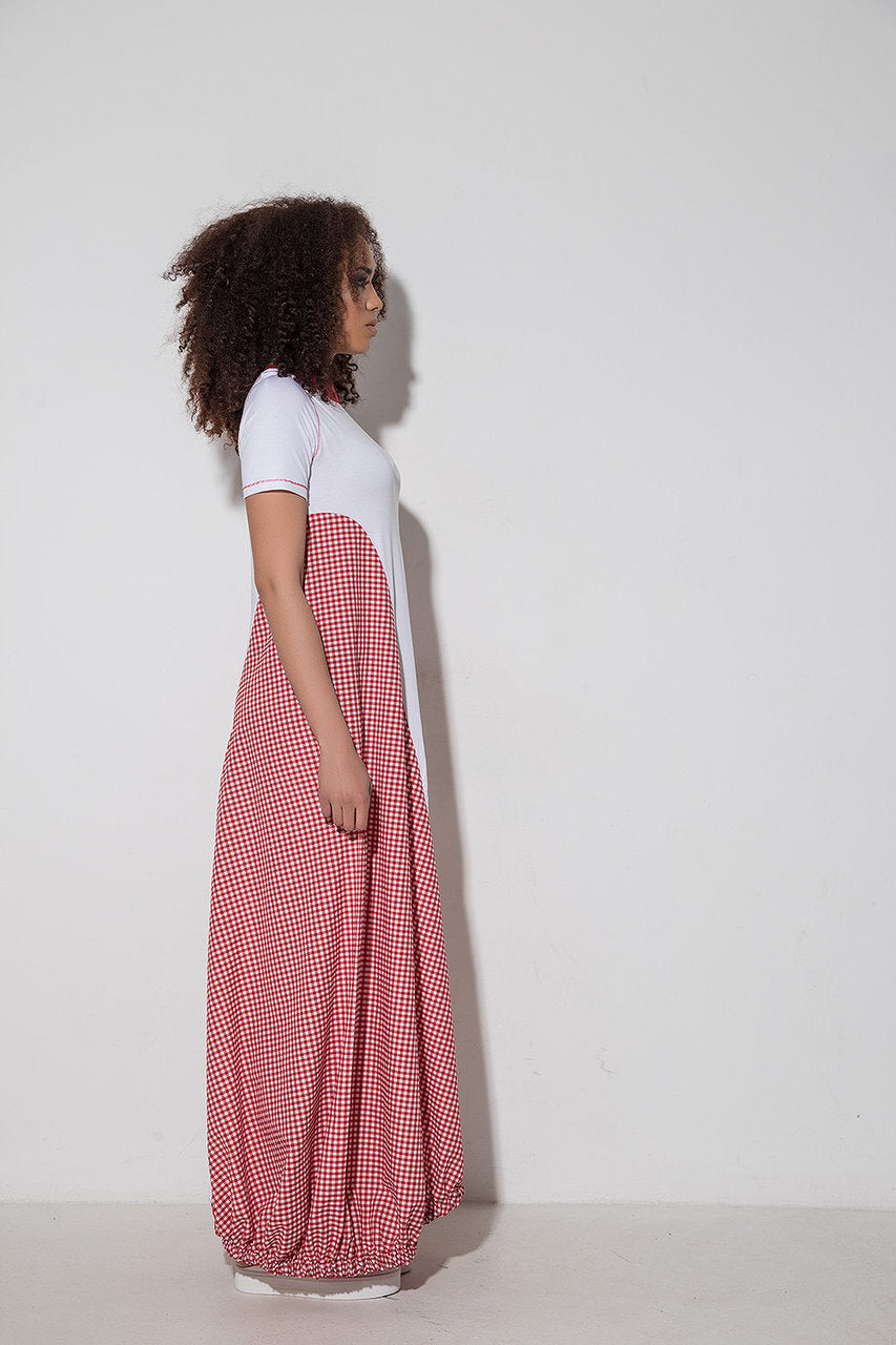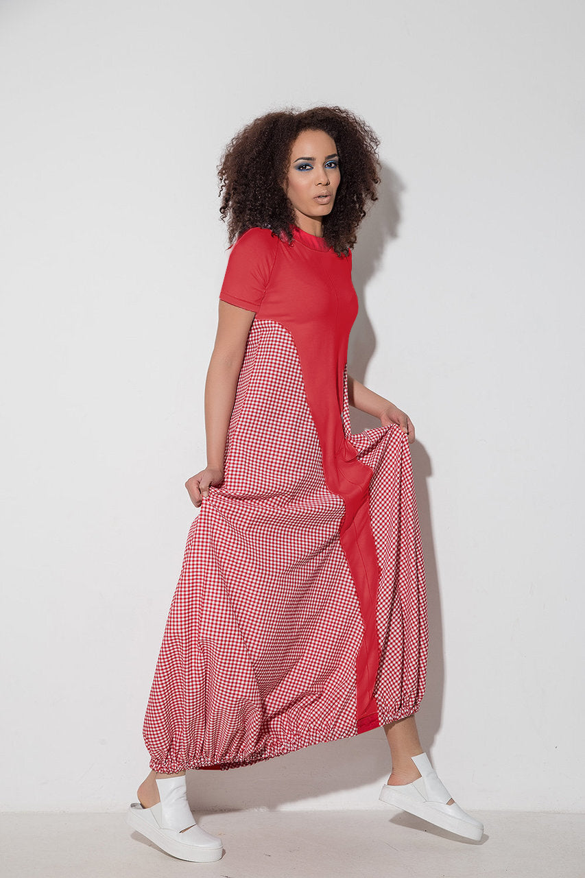 Get ready to make a statement with our stunning maxi dress, perfect for any occasion. With its classic crew neckline in contrasting red cotton, this dress features front and back jersey patterns in a solid block color, complemented by a contrasting gingham pattern. The full maxi length is accentuated with gathering elasticated detail. The short sleeves are perfect for warmer days, keeping you cool and comfortable while exuding an effortless charm. With practical side pockets and an invisible back zip fly, this timeless piece is as practical as it is beautiful. Made from high-quality fabric, this dress is sure to be a staple in your wardrobe for years to come. Don't miss out on this must-have dress!