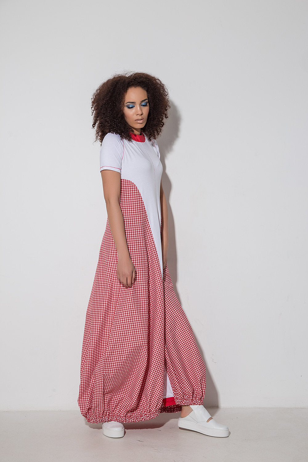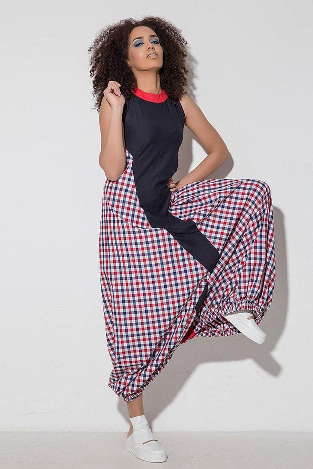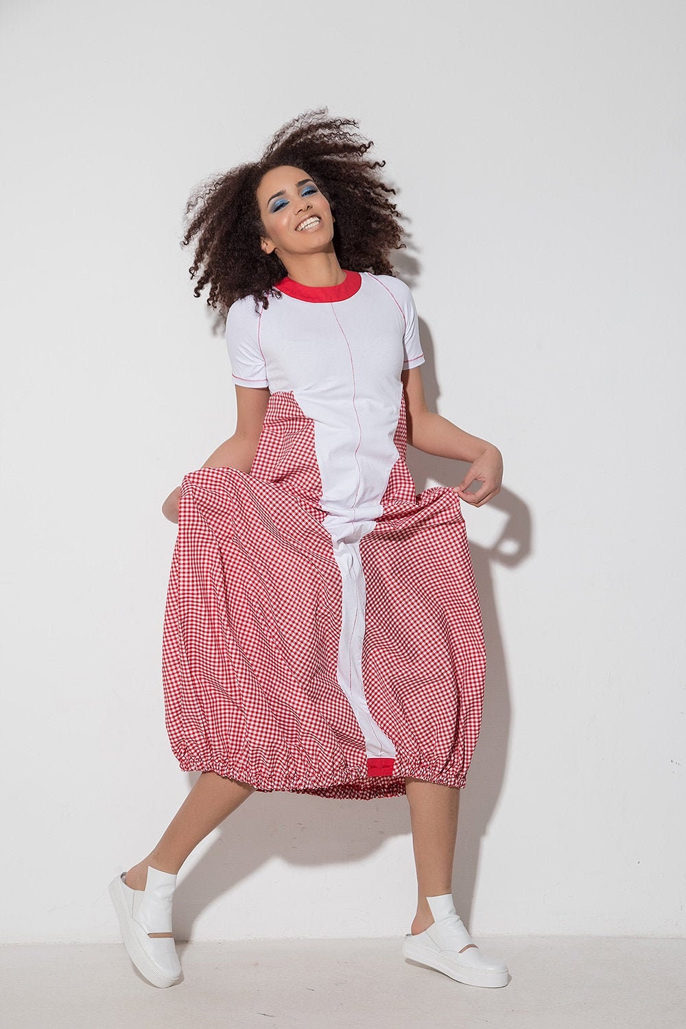 Get ready to make a statement with our stunning maxi dress, perfect for any occasion. With its classic crew neckline in contrasting red cotton, this dress features front and back jersey patterns in a solid block color, complemented by a contrasting gingham pattern. The full maxi length is accentuated with gathering elasticated detail. The short sleeves are perfect for warmer days, keeping you cool and comfortable while exuding an effortless charm. With practical side pockets and an invisible back zip fly, this timeless piece is as practical as it is beautiful. Made from high-quality fabric, this dress is sure to be a staple in your wardrobe for years to come. Don't miss out on this must-have dress!