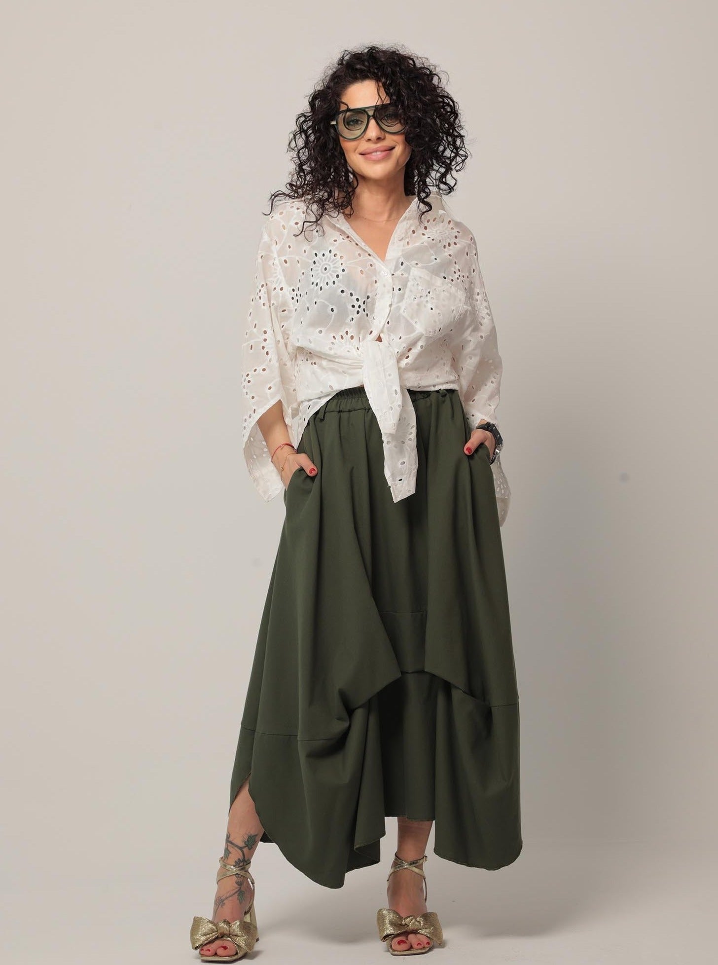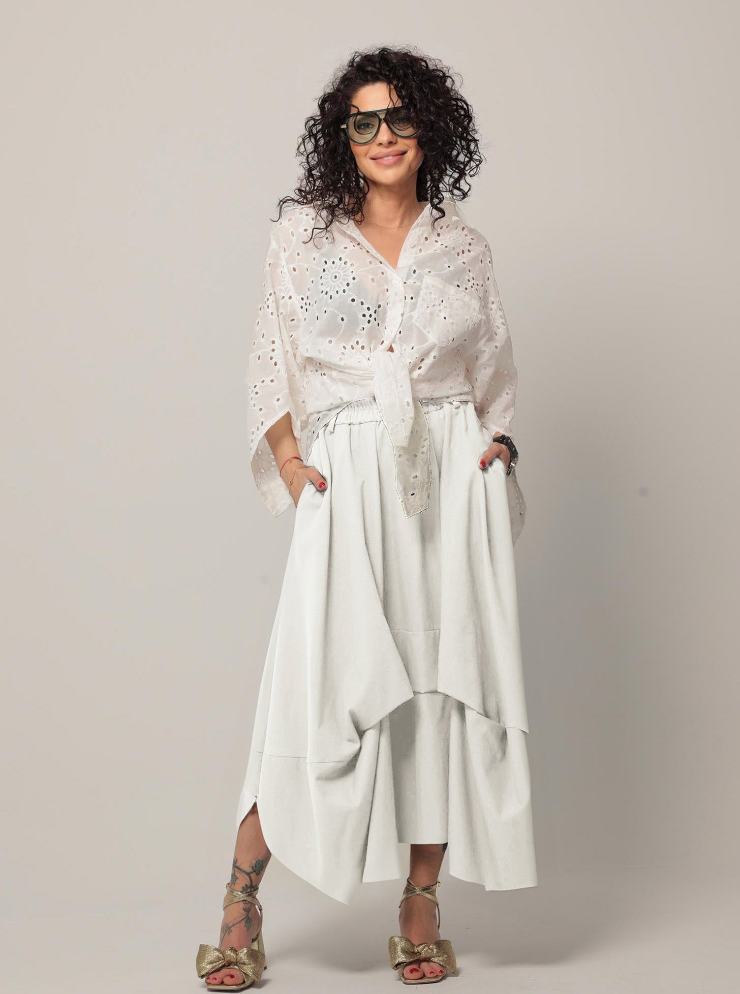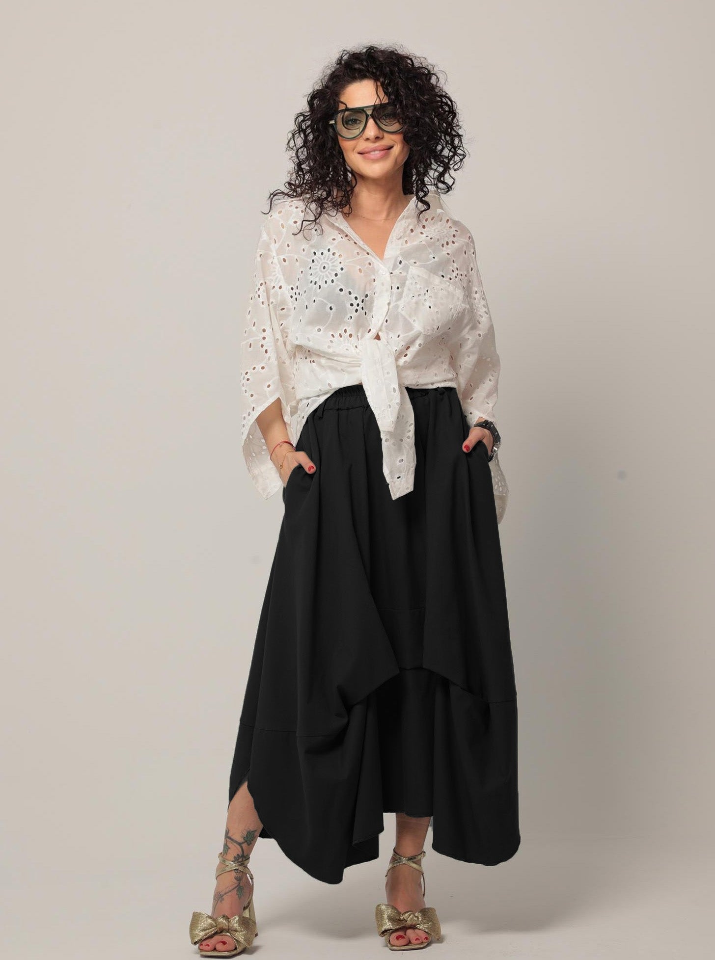 Discover the Mei Skirt, a perfect blend of sustainability and style. Crafted from a mix of cotton and recycled polyester, this skirt features an eye-catching asymmetrical design and a comfortable elastic waistband. Its extravagant look makes it a standout piece for any occasion. Add a touch of modern elegance to your wardrobe with the Mei Skirt.