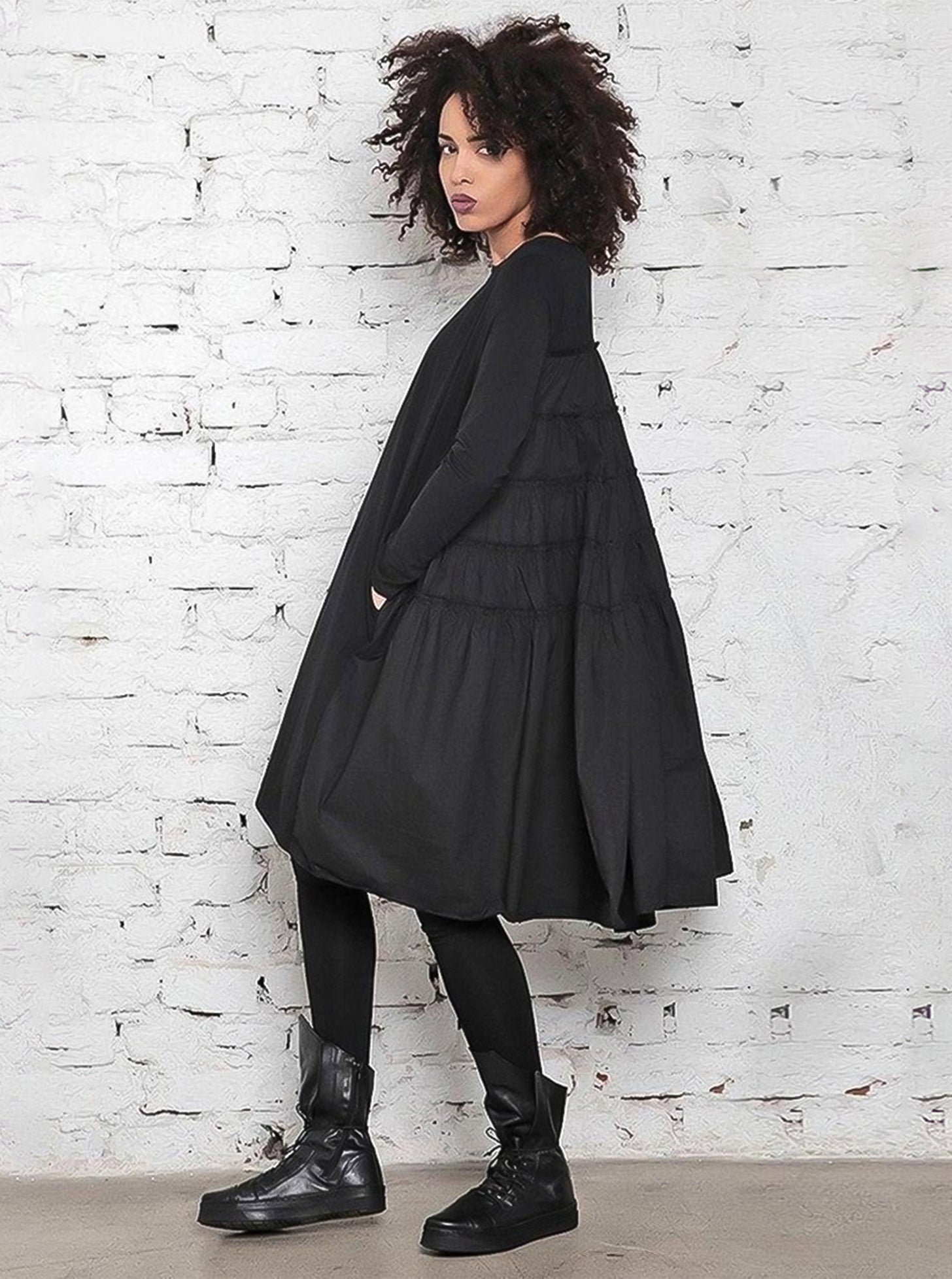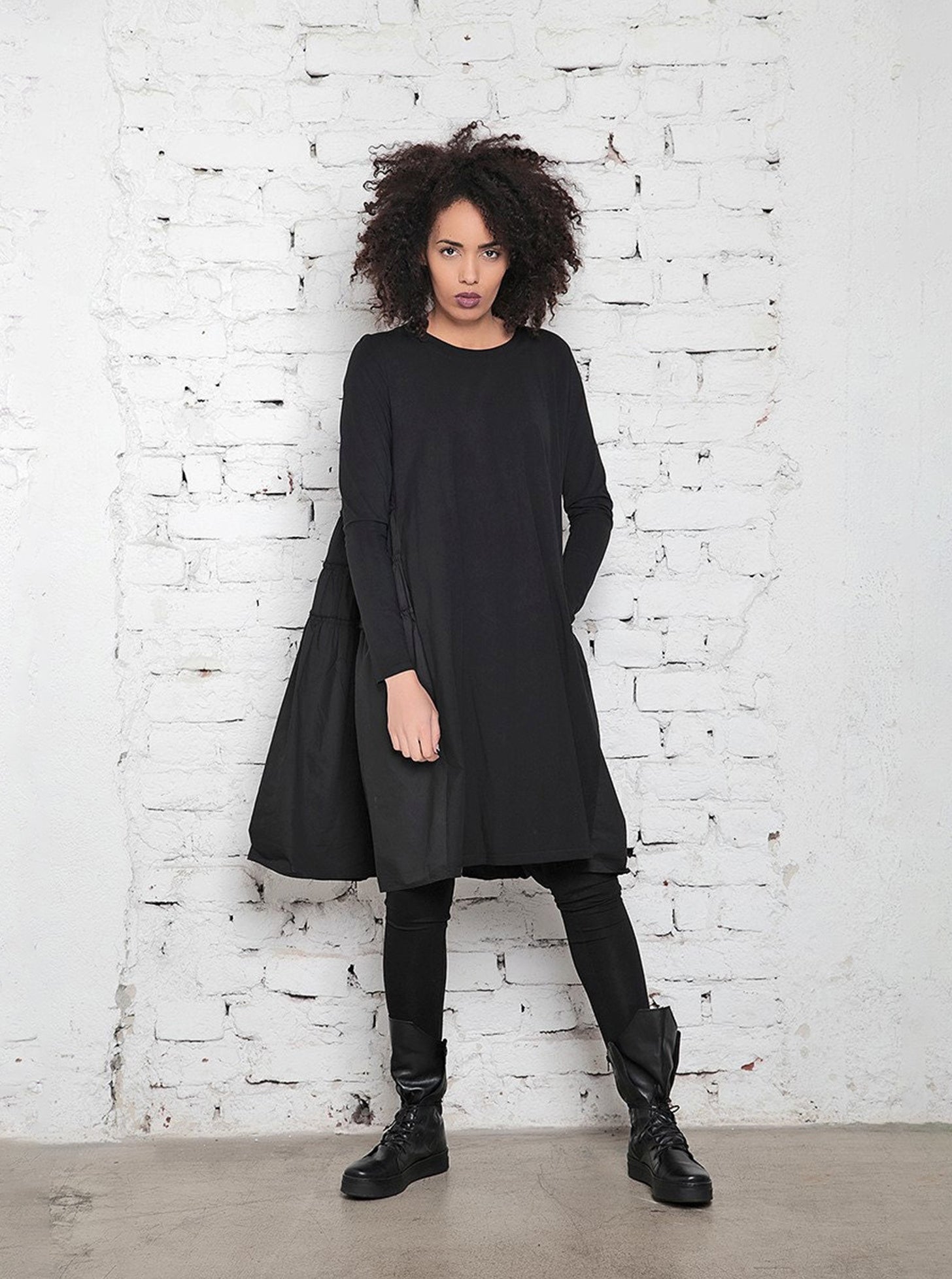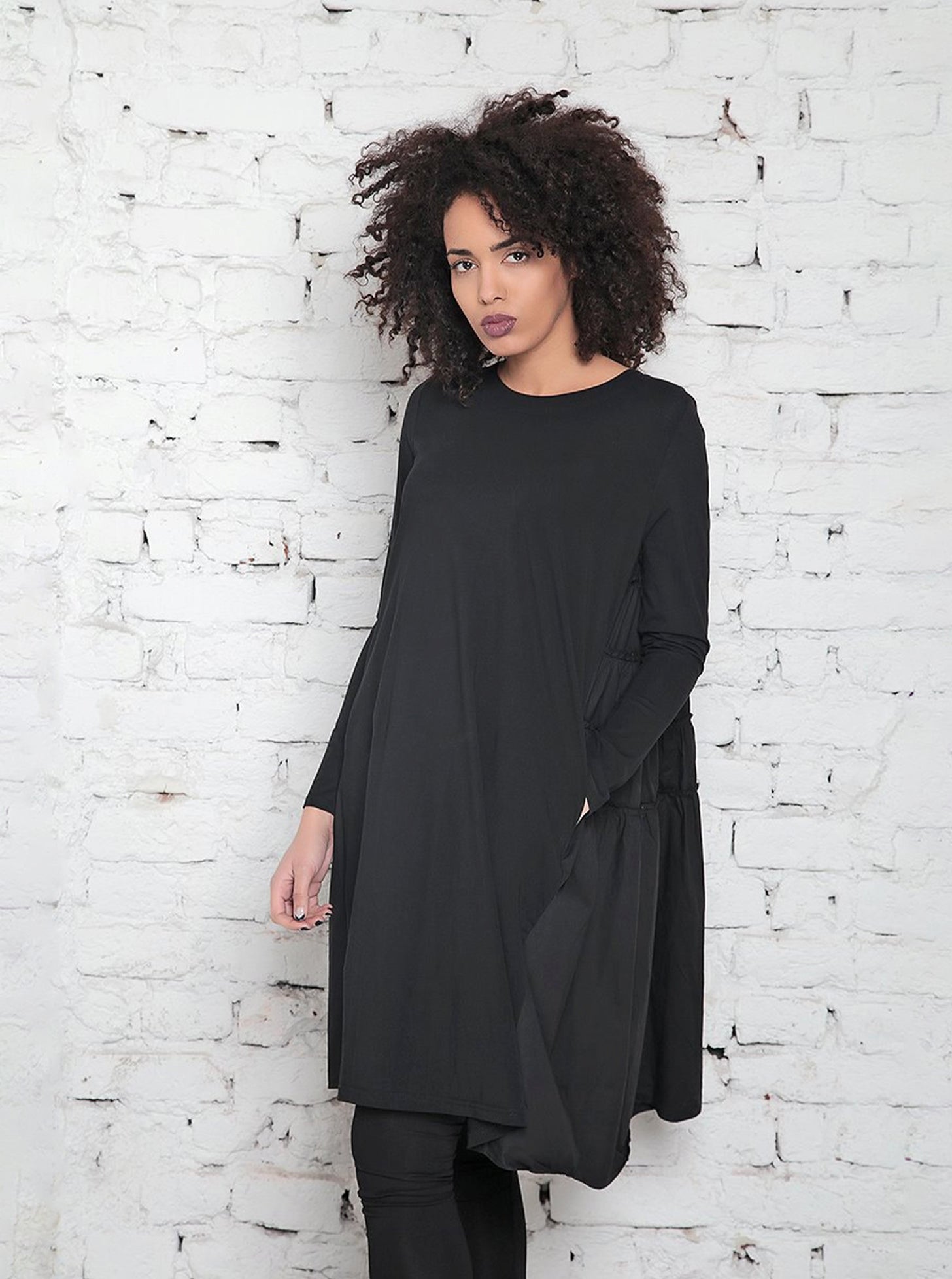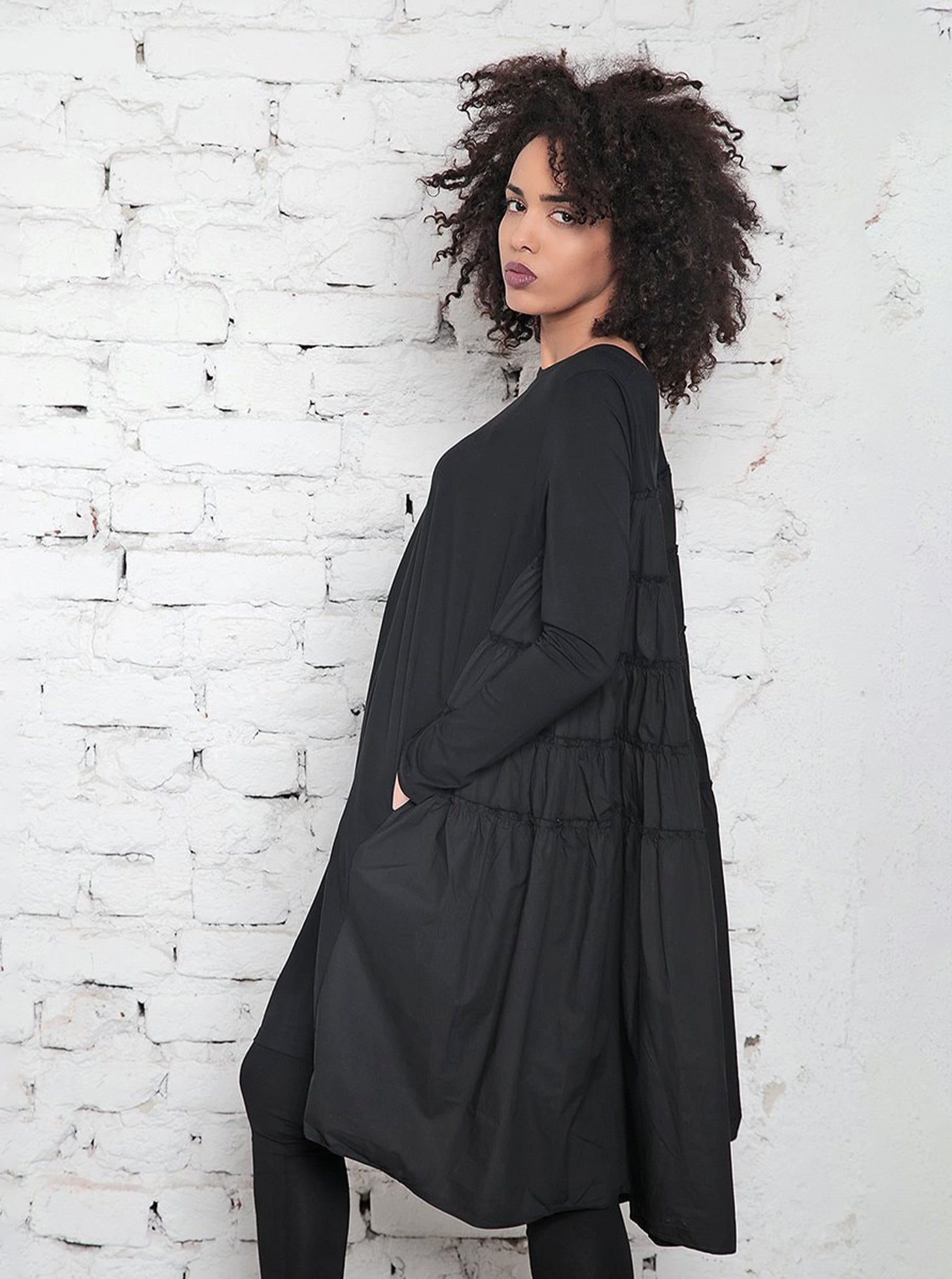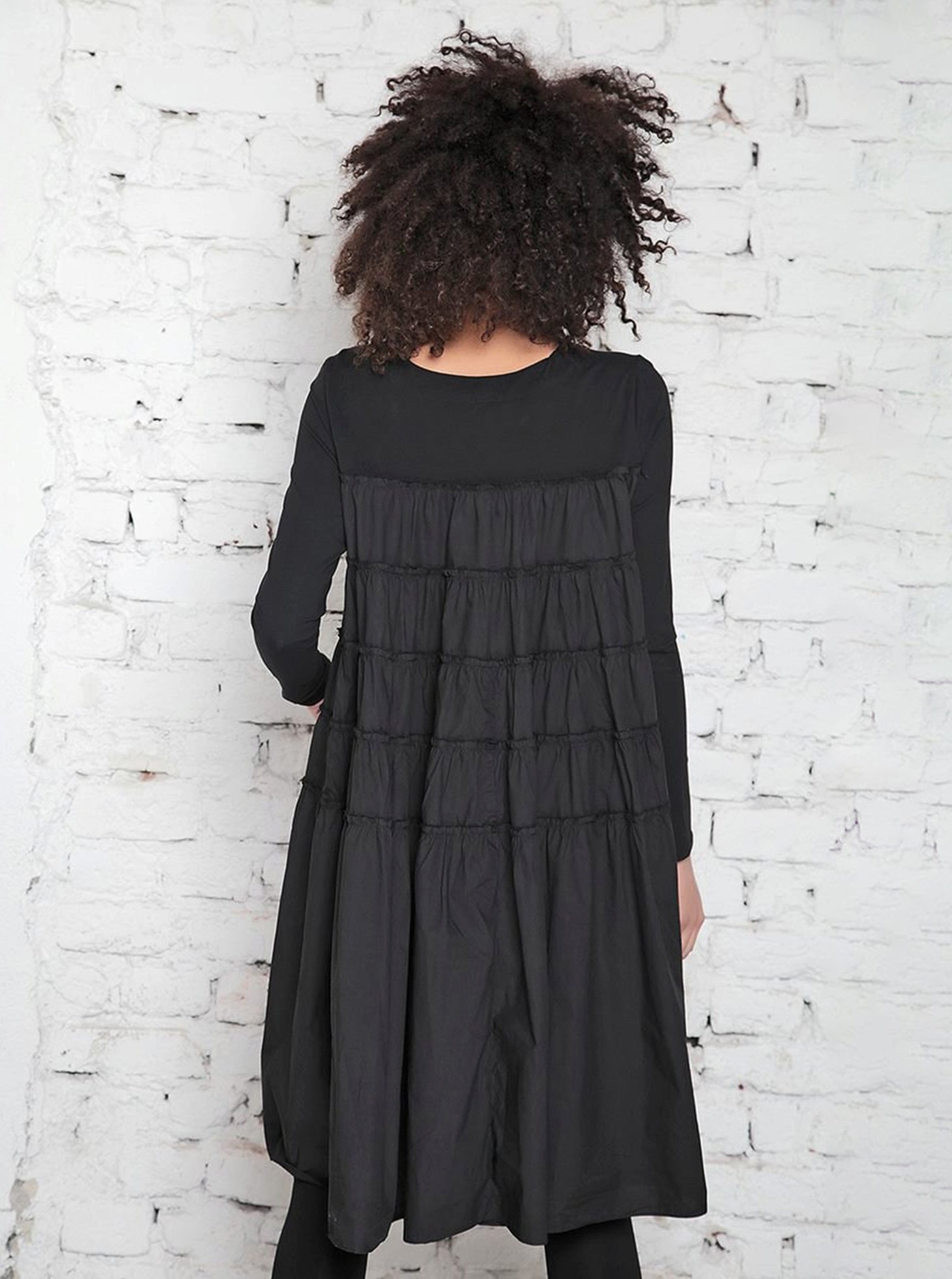 Introducing our stunning and edgy dress AMIKE! This piece features a strong baloon silhouette, a classic crew neckline, and long length sleeves that exude an elegant vibe. The soft jersey base creates a comfortable and flexible fit, perfect for any occasion. The back of this garment boasts a rich gathered design in poplin cotton, adding a unique and eye-catching touch. With its knee-length style, this garment is versatile and can be dressed up or down. Don't miss out on this must-have addition to your wardrobe!