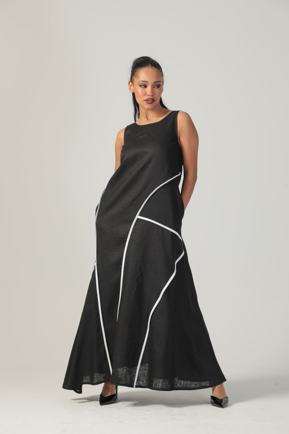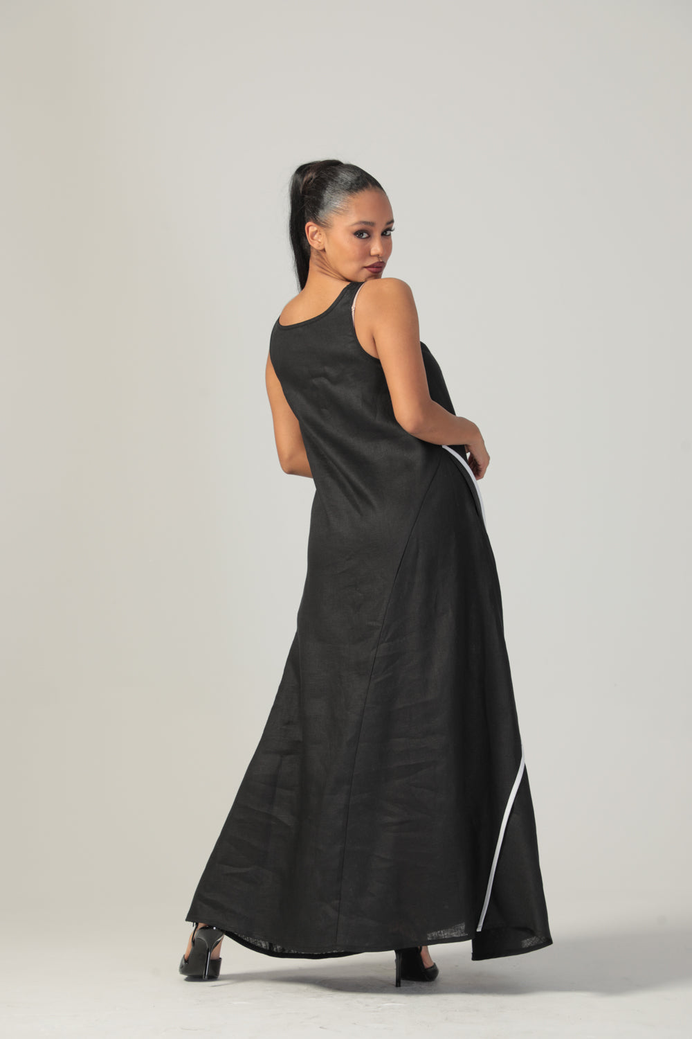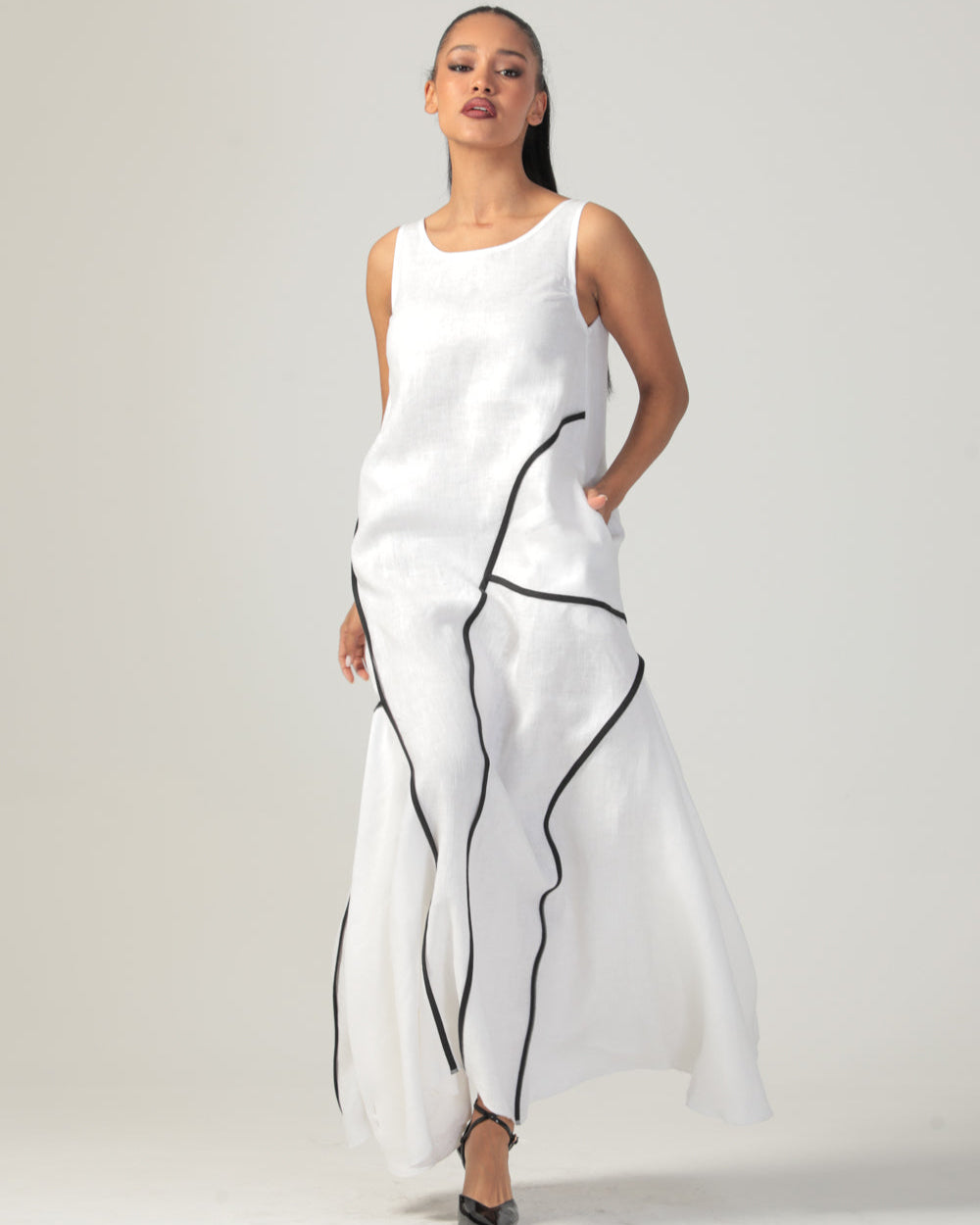 The Sabrina Linen Dress redefines chic comfort with its sleeveless, flowing silhouette and asymmetrical design that flatters every figure. Crafted from breathable linen, it gently drapes over the body, while bold contrast stitching adds a contemporary edge – a must-have trend this season!
