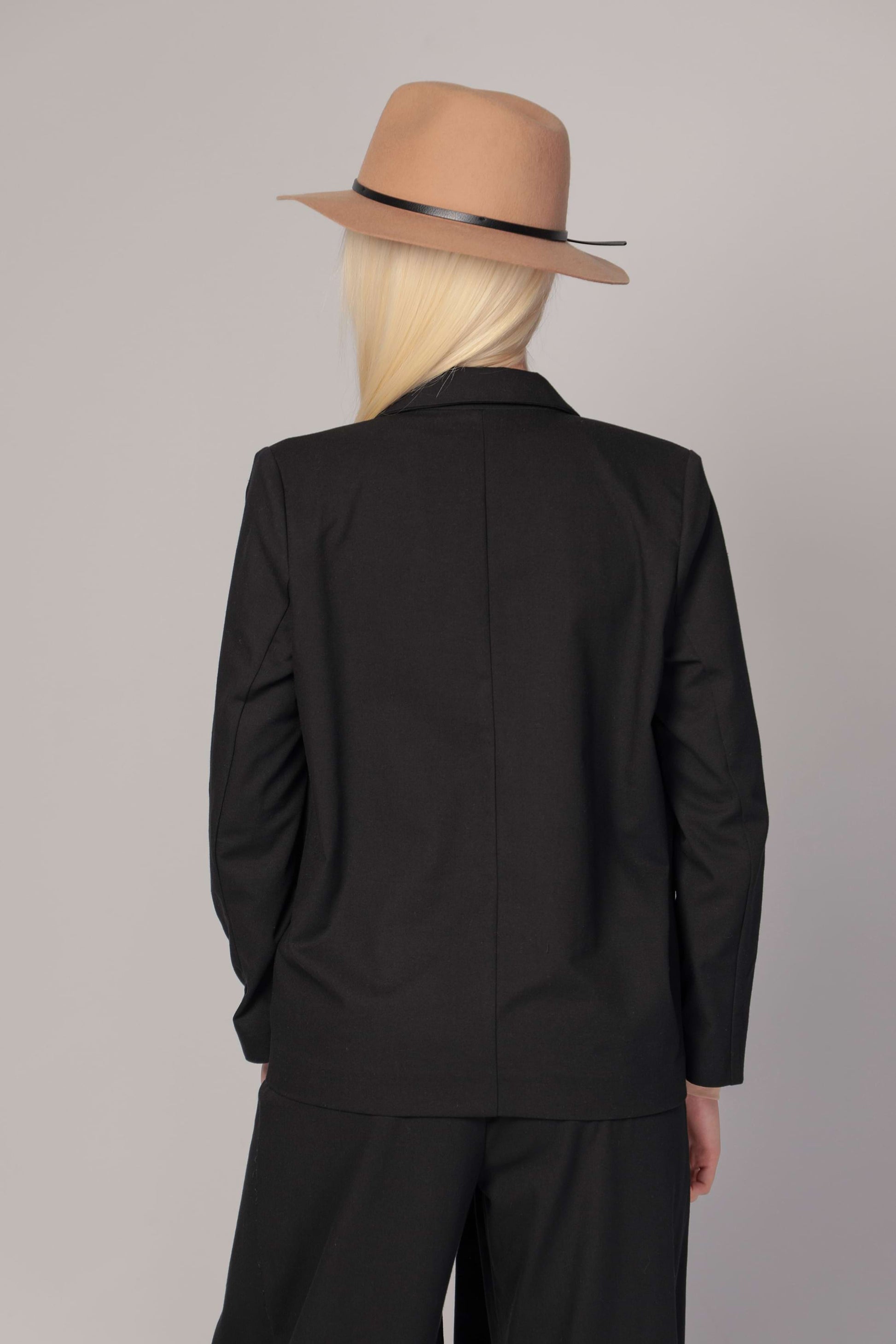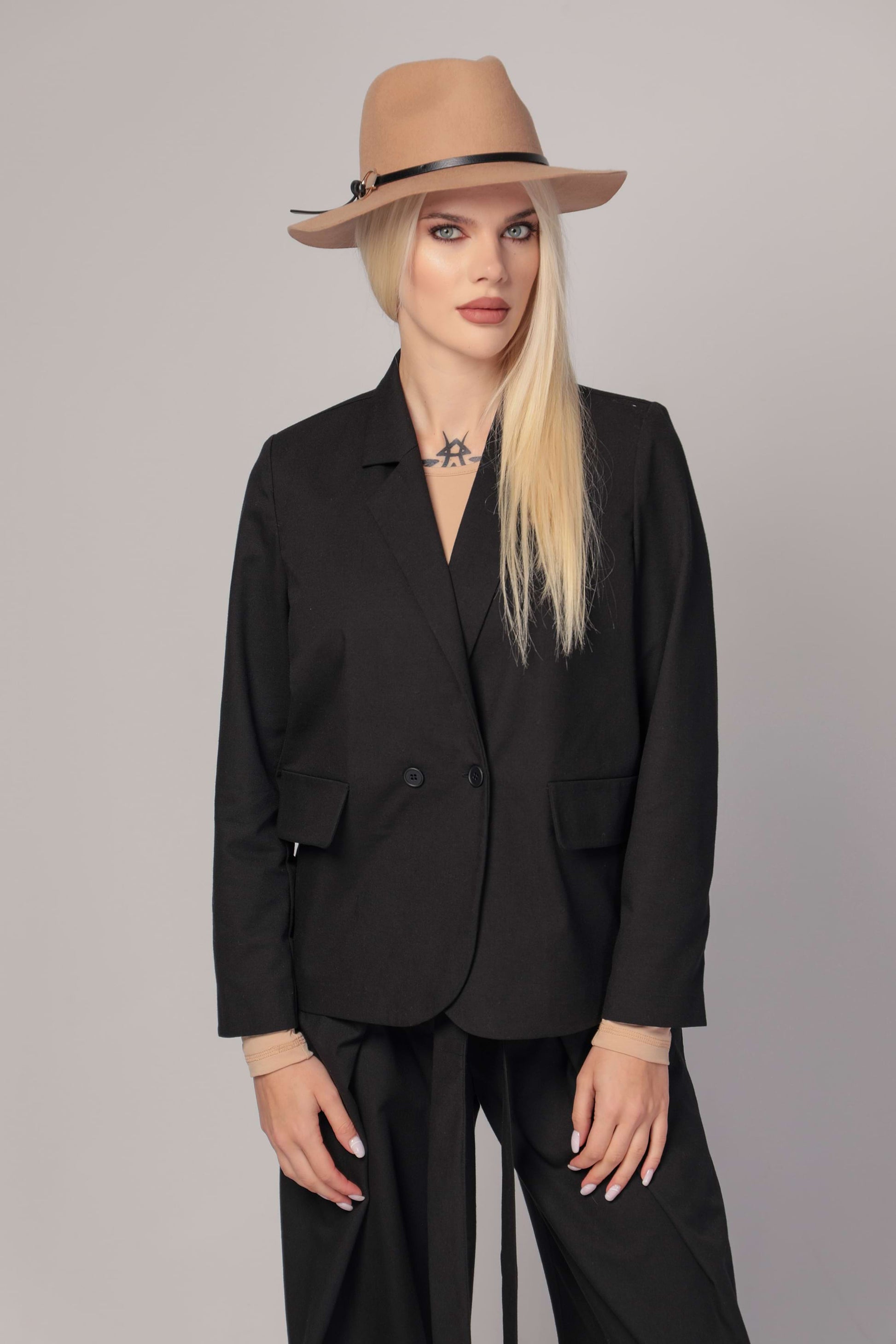 Introducing a true wardrobe essential that effortlessly combines style and versatility. This piece is the ultimate embodiment of timeless fashion, designed to seamlessly transition from a blazer to a jacket, making it a versatile addition to your collection. Its classic and relaxed silhouette ensures a comfortable fit while exuding an air of sophistication. The practical front pockets, one on each side, add a touch of functionality to its elegant design, making it both stylish and practical. With a classical lapel collar and single-breasted front featuring two buttons, this piece radiates a sense of refinement suitable for any occasion. The long sleeves in a straight fit are thoughtfully lined, enhancing both comfort and structure.