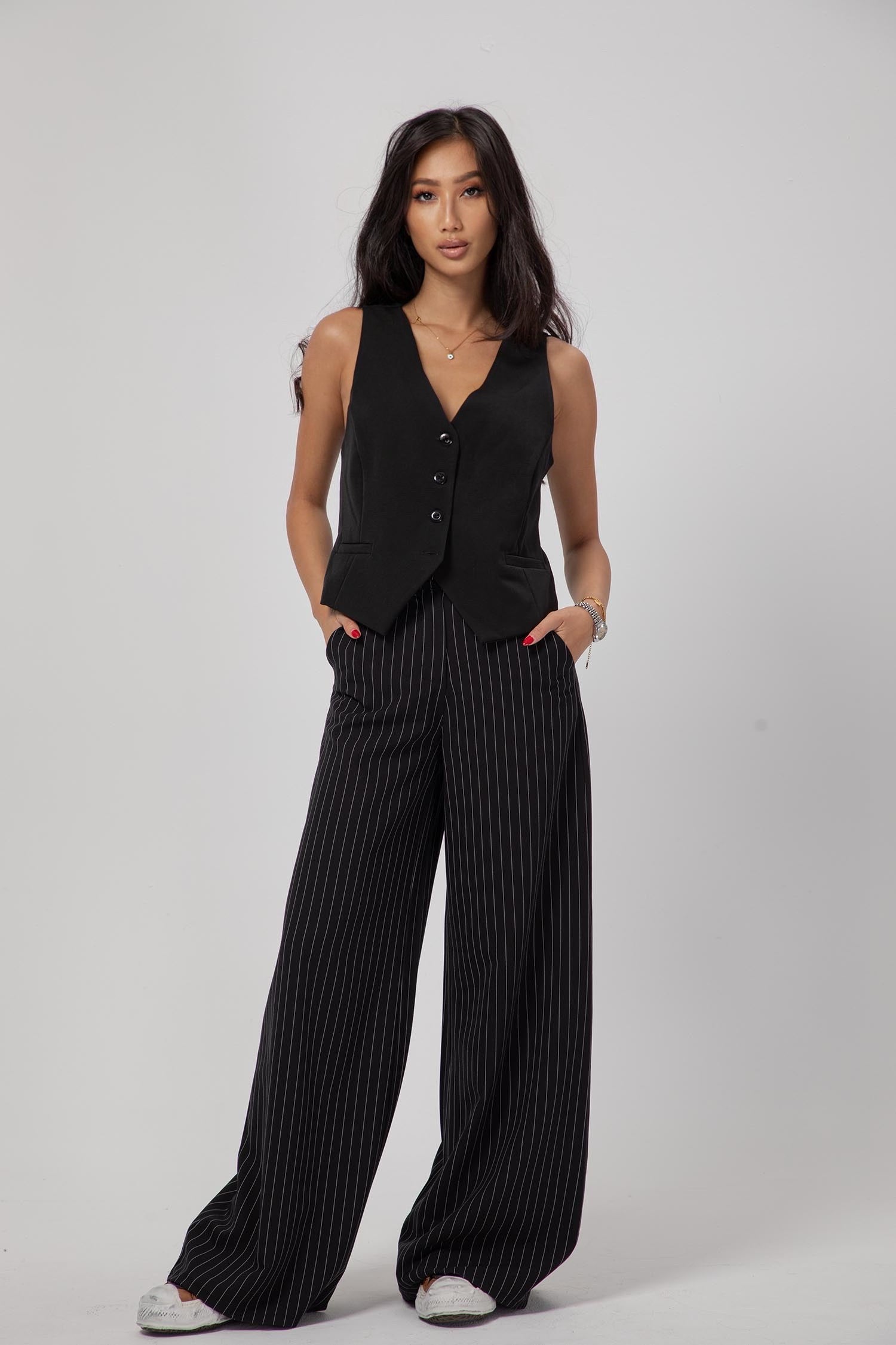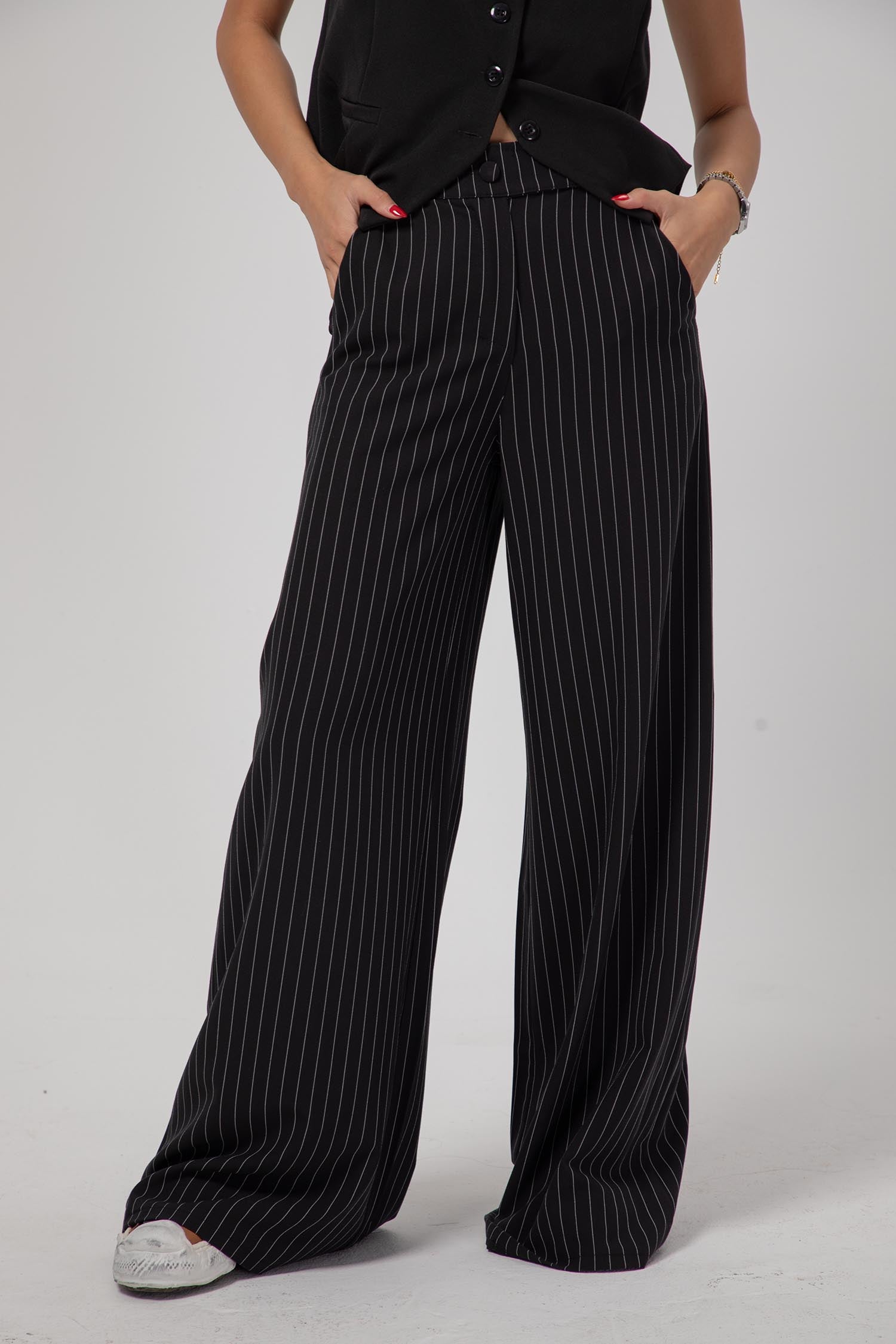 Introducing Nеrra, the epitome of laid-back sophistication in a pair of pants. These trousers offer a comfortable, relaxed fit that complements your style effortlessly. Nerra boasts a mid-rise waist, offering the perfect balance between comfort and fashion. The front pockets are stylishly understated in Italian style, adding both elegance and convenience to your ensemble. Adding to its charm, Nerra features a unique stripe pattern that elongates your figure, making you look and feel fantastic. The fabric is a blend of polyviscose with a slight stretch, ensuring both comfort and freedom of movement. With Nerra, you can effortlessly transition from casual to formal, all while embracing the beauty of relaxed elegance.