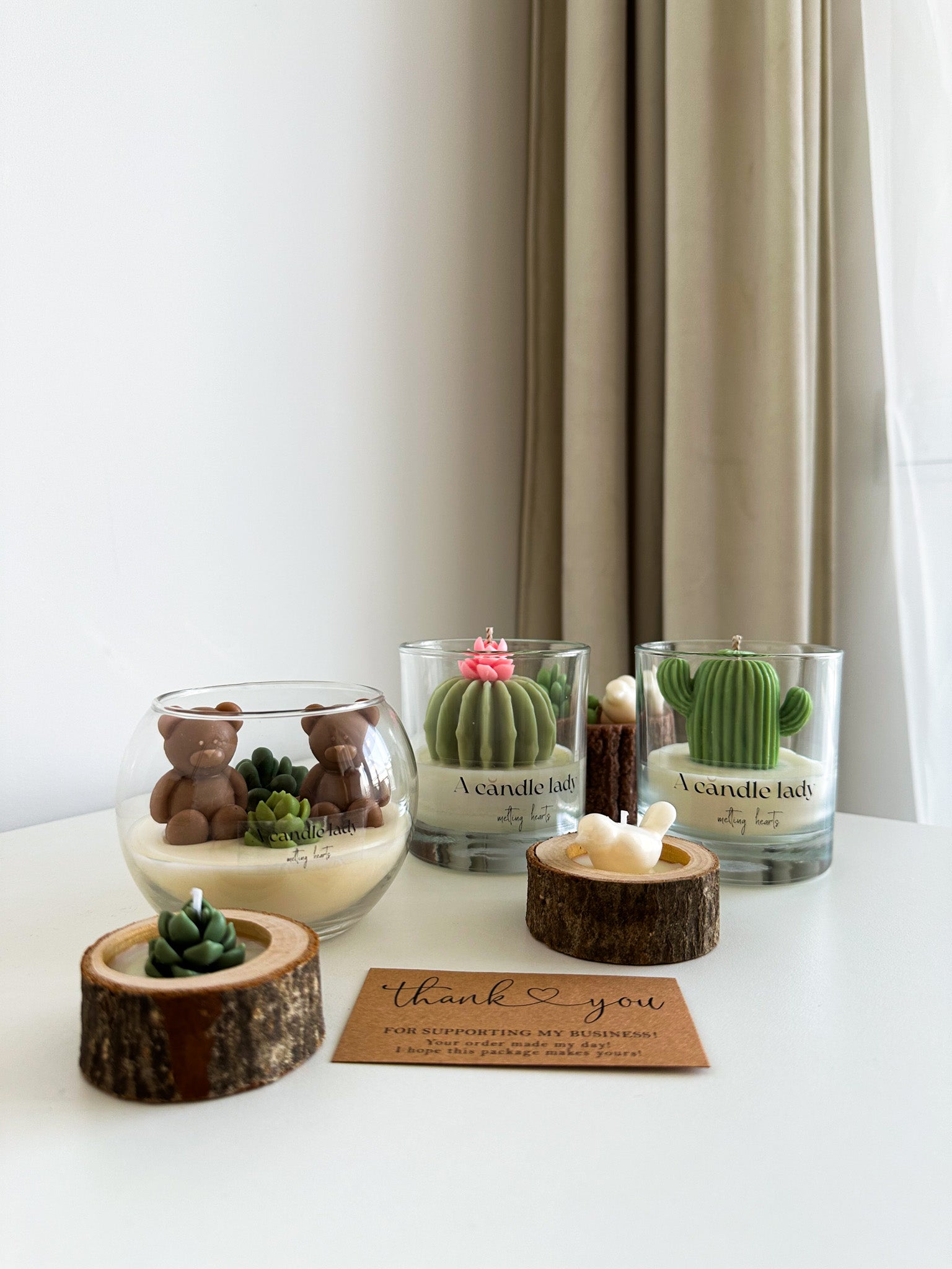 Immerse yourself in the unique charm of our Soy Cactus Candle. Handcrafted from premium soy wax, this set features a variety of cactus-shaped candles, each artfully designed to resemble lifelike cacti with intricate details that capture the texture and essence of these desert plants. The diverse cactus forms add a touch of nature-inspired decor to any space while the clean-burning soy wax provides a long-lasting and eco-friendly glow. Perfect as a decorative piece or a thoughtful gift, our Soy Cactus Candle brings a touch of the outdoors inside, radiating warmth and style.